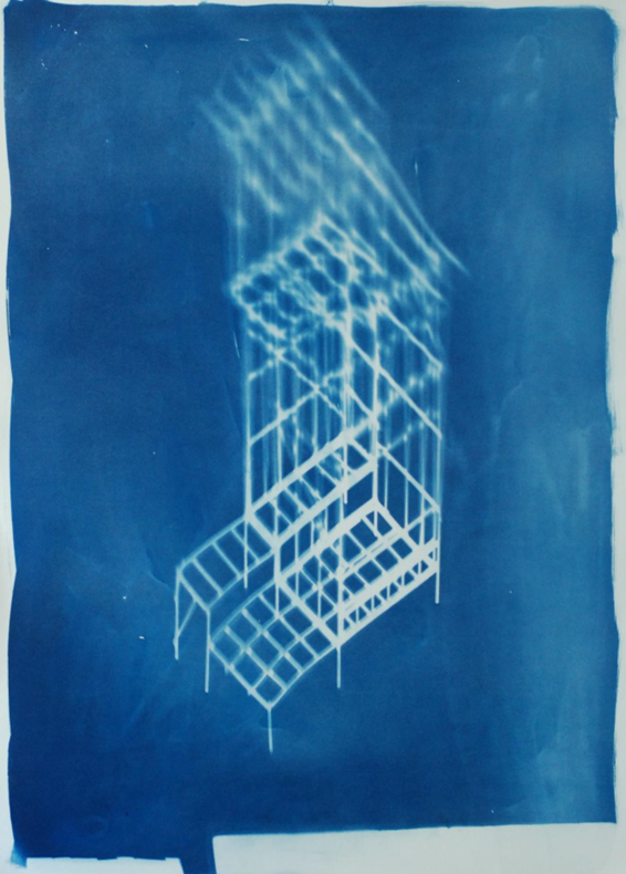 ^ House Plan: Blueprint of sun hitting from South West, Winter afternoon, 2019. 645x1000mm Cyanotype on Bristol 300gsm
